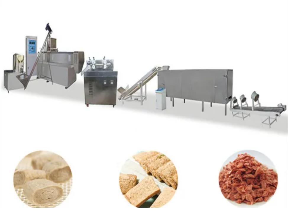 Deze lijn neemt Ontvete sojaboonmaaltijd en pindamaaltijd als grondstoffen. Na zich het mengen, het uitdrijven, het snijden en het drogen, wordt de maaltijd de textuur van de laagvezel. Geëindigd - de producten hebben hoogte - proteïne; kijk en proef als vlees; gemakkelijk aan het absorberen van olie, water en aroma; zonder cholesterol en dierlijk vet, zodat wordt het wijd gebruikt in de vleeswarenindustrie, snel voedselproductie, diepgevroren voedselproductie, en allerlei vegetarisch snacks en voedsel.